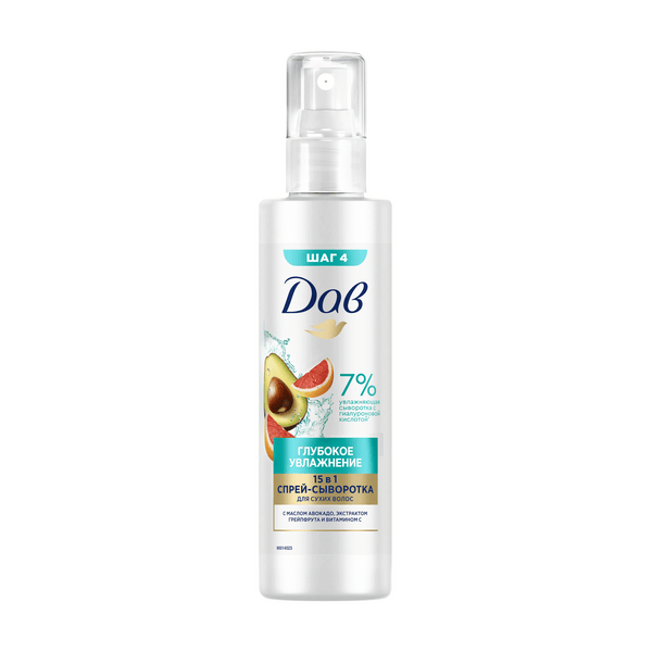 Дав спрей сыворотка для волос увлажняющая для легкого расчесывания 15 в 1 190 млСпрей-сыворотка для волос Дав Глубокое увлажнение 15 в 1 — это эффективное уходовое средство для локонов с гиалуроновой кислотой. Компоненты продукта содержат 7% увлажняющую сыворотку с гиалуроновой кислотой, масло авокадо, экстракт грейпфрута и витамин С. Сыворотка для волос несмываемая многофункциональная 15-ю незаменимыми ингредиентами: - глубоко увлажняет - увлажняет - от термовоздействия - питает - выделяет ломкость и срезание волос - определенная способность и способность - выделять - делает волосы послушными - от основания - основания. - фактурная мягкость - участвует расчесывание - мгновенно преображает - дарит приятный аромат. Результат применения: глубоко увлажненные волосы. Спрей-сыворотка для волос для легкого расчесывания 15в1 имеет приятный аромат грейпфрута.