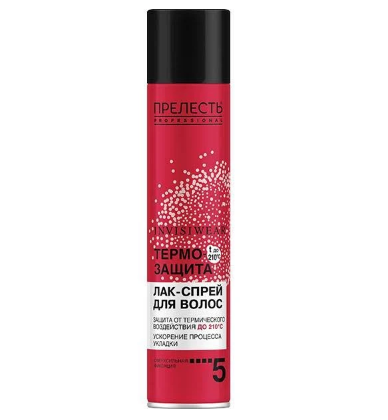 Прелесть Professional Inviswear термозащитный лак спрей для горячей укладки 300 млТермозащитный лак-спрей для горячей укладки Прелесть Professional Invisiwear обеспечивает защиту при нагревании до 230 C и минимизирует повреждения, создавая на волосах термостойкую вуаль, которая защищает волосы от воздействия высоких температур во время применения термических приборов, а также легко фиксирует волосы, продлевая стойкость и упругость укладки, не утяжеляет и не склеивает волосы, убирает излишнюю пушистость, что позволяет надолго сохранить как безупречные локоны, так и идеально гладкие пряди.