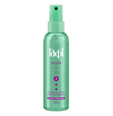 Тафт объём жидкость для укладки очень сильной фиксации 150 млНовый Тафт воздушный Объем благодаря формуле с комплексом коллаген-бамбук придаст волосам невесомый объем от корней за считанные секунды – без утяжеления! Объем и фиксация до 24 часов без склеивания и следов. Помогает защитить волосы от пересушивания без утяжеления. Воздушный объем для всех типов волос. Легкость и подвижность. Очень сильная фиксация.