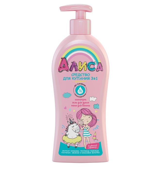Алиса средство для купания для детей 3в1 350 млТри средства для купания в одном флаконе! Удобный формат 3 в 1 можно использовать как шампунь, гель для душа и пену для ванны. Специальная формула имеет мягкую моющую основу, нейтральный уровень рН и не вызывает слез, поэтому подходит даже для самых нежных принцесс. Состав средства обогащен экстрактом клубники, протеинами пшеницы, пантенолом, овсяным и кокосовым молочком. Такой комплекс бережно питает и увлажняет волосы вашей малышки, а так же защищает кожу от сухости и раздражения.