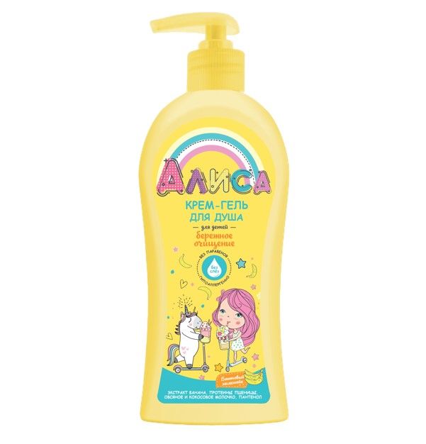 Алиса крем гель для душа детский бережное очищение 350 млСпециальная формула имеет мягкую моющую основу, нейтральный уровень рН и не вызывает слез.