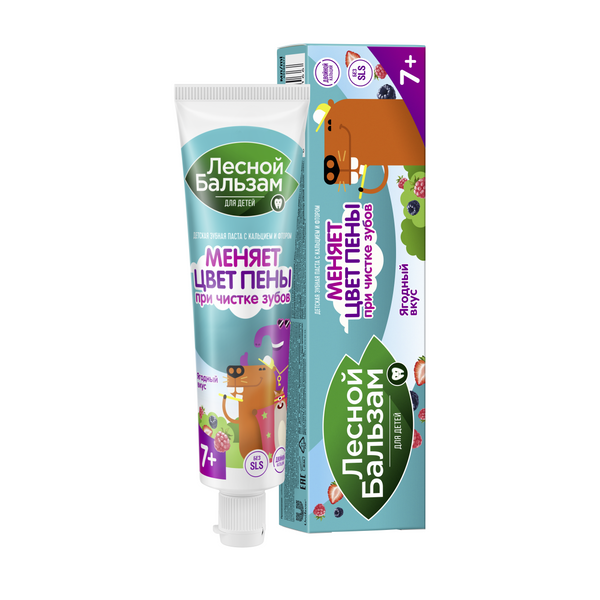 Лесной бальзам паста зубная для детей с 7 лет ягодный взрыв 50 млДетская зубная паста Лесной бальзам с 7 лет исполняет мечты каждой мамы! Это первая зубная паста, меняющая цвет пены в процессе чистки зубов. Поможет воспитать правильную привычку чистки зубов с раннего возраста. А главное проверить, почистил ли ребенок зубы – теперь намного легче! Особенности формулы: 1) Зеленые капсулы в составе зубной пасты постепенно раскрываются во время чистки и меняют цвет пены с белого на зеленый, превращая чистку зубов в увлекательное занятие! 2) Цвет пены меняется постепенно: чем дольше ребенок чистит зубы, тем сильнее пена приобретает зеленый оттенок и тем качественнее проведена чистка зубов 3) Формула с двойным кальцием укрепляет эмаль зубов, способствует правильному созреванию эмали и делает ее до 2 раз плотнее 4) Натуральный антибактериальный комплекс на основе экстракта магнолии защищает от образования налета и развития кариеса 5) Содержит биоактивный фтор для усиления антикариесного эффекта 6) Ягодный вкус с умеренной интенсивностью освежения 7) без SLS, безе SLES 8) Зубная паста для детей Лесной бальзам 7+ разработана совместно со стоматологами и протестирована на кафедре детской стоматологии, не оказывает раздражающего или токсического воздействия на полость рта. Более того в пасте используется специальный мягкий пенообразователь с минимальным воздействием на слизистую полости рта. 9) Безопасна при случайном проглатывании