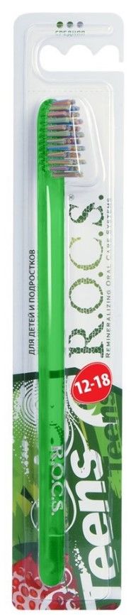 ROCS зубная щётка teens 12-18 средняяУникальная форма головки зубной щетки R.O.C.S. - скошенная к концу головки щётки подстрижка щетины - повышает качество чистки поверхности зубов и позволяет с легкостью проникать в труднодоступные участки зубного ряда, а так же качественно очищать пространство между зубами, не повреждая десны. Тонкая плоская прозрачная ручка обеспечивает необычайную маневренность на всех участках зубного ряда.