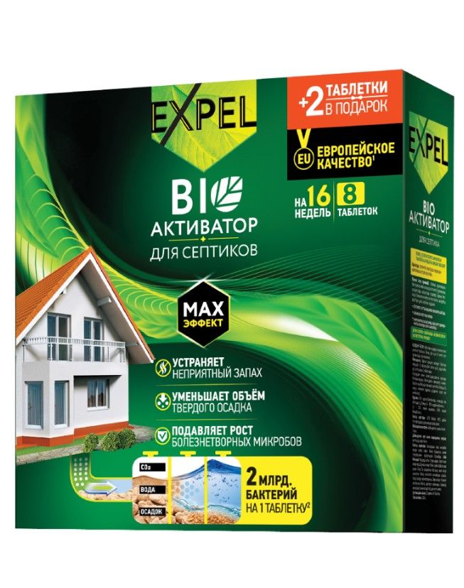Expel биоактиватор для септиков 8 таблеток в упПоездка за город - маленький отпуск! Чтобы ваш отдых был приятным и комфортным, лучше заранее позаботиться о приобретении эффективных качественных средств для септика. Биоактиватор EXPEL для септика и автономных систем - это современное решение в уникальном инновационном формате двухслойной таблетки. Таблетка EXPEL содержит энзимы и концентрированные бактерии, которые разлагают фекальные массы на воду, углекислый газ и соли, тем самым обеспечивая эффективную бесперебойную работу септика. Максимальный показатель - 2 млрд. бактерий на 1 таблетку! Инновационный формат - двухслойная таблетка. Устраняет неприятный запах. Уменьшает объем твердого осадка. Удобство и простота применения. Экономичный расход: 10 таблеток - 20 недель использования. Европейское качество.