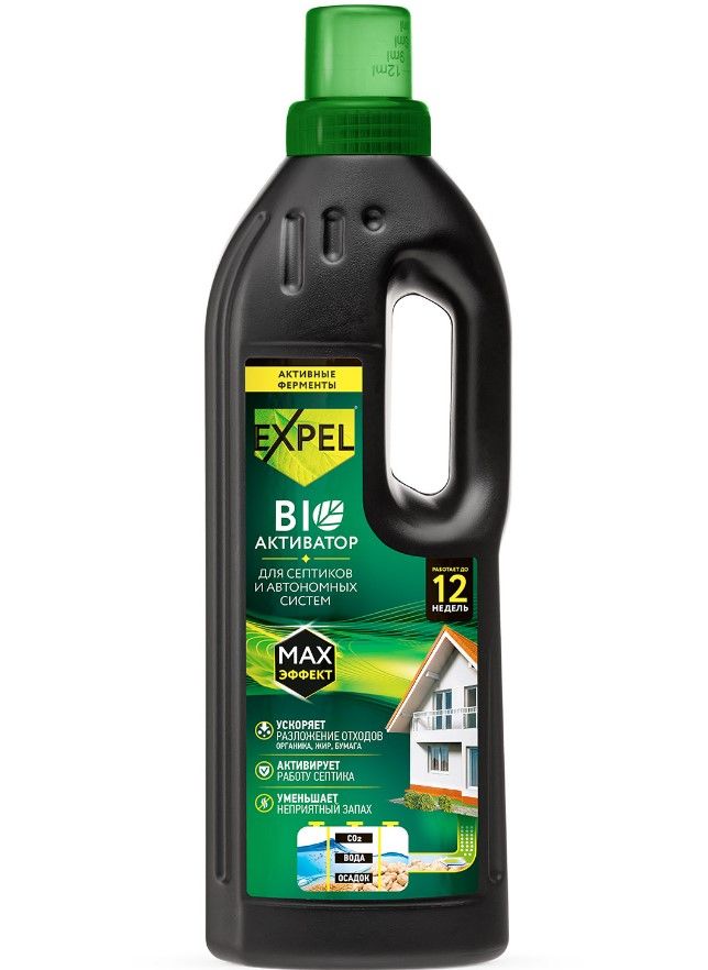 Expel жидкий биоактиватор для септиков и автономных систем 750 млЕсли вы – счастливый обладатель загородного дома или дачи, позвольте нам сделать ваше пребывание там максимально комфортным.Жидкий биоактиватор EXPEL для септиков и автономных систем на основе активных ферментов выведет ваши системы утилизации и переработки органических отходов на новый уровень эффективности.Композиция энзимов активирует работу септика и ускоряет переработку органических отходов – белков, жиров и пр. Оптимально подобранный для анаэробных условий септик-танка состав биоактивных компонентов подавляет неприятный запах, уменьшает объём твёрдого осадка и снижает потребность в автоассенизации.Важно заметить – в отличие от жидких биоактиваторов на основе бактерий, формула Expel позволяет с удовольствием использовать продукт, который будет эффективен на протяжении всего срока годности!3 месяца активной работы септика или вашей автономной системы – гарантия EXPEL!• Активирует работу септика • Ускоряет разложение белков, жиров и других отходов• Уменьшает объем твердого осадка• Уменьшает неприятный запах• Снижает потребность в автоассенизации• 3 месяца активной работы