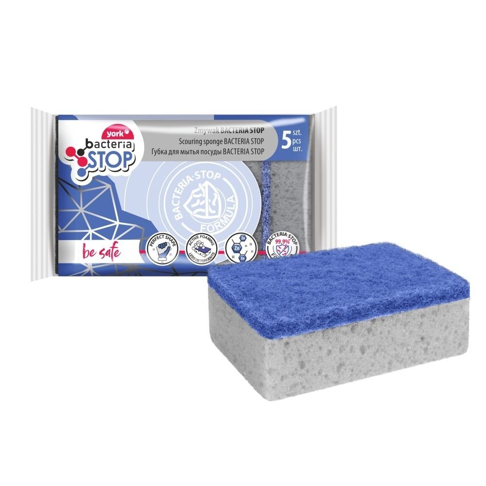 York губки для посуды 5 шт bacteria stopГубки для мытья посуды с антибактериальным эффектом и удобной формой. Незаменимы в доме, где есть маленькие дети. Можно использовать без применения химических средств, не беспокоясь о стерильности губки. Шероховатая сторона позволяет удалять самые стойкие загрязнения. Мягкая сторона подходит для универсального использования
