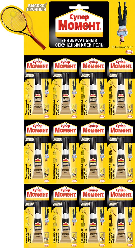 Момент Супер клей на карте 3 г заказ кратно 12 штукамПредназначен для всех видов быстрых ремонтных работ в быту, мастерской, автомобиле, при конструировании моделей. Склеивает различные виды пластмассы, резину, металлы, дерево, фарфор, керамику, кожу, пробку, ткань, картон и бумагу. Морозостойкий, водостойкий, устойчив к воздействию растворителей. Не пригоден для склеивания полипропилена, полиэтилена, политетрафторэтилена (тефлона), стекла, глазированных поверхностей и силиконовой резины. Также не пригоден для склеивания очень мягкой кожи. Запрещено применять клей для склеивания материалов, которые будут непосредственно контактировать с пищевыми продуктами и питьевой водой.