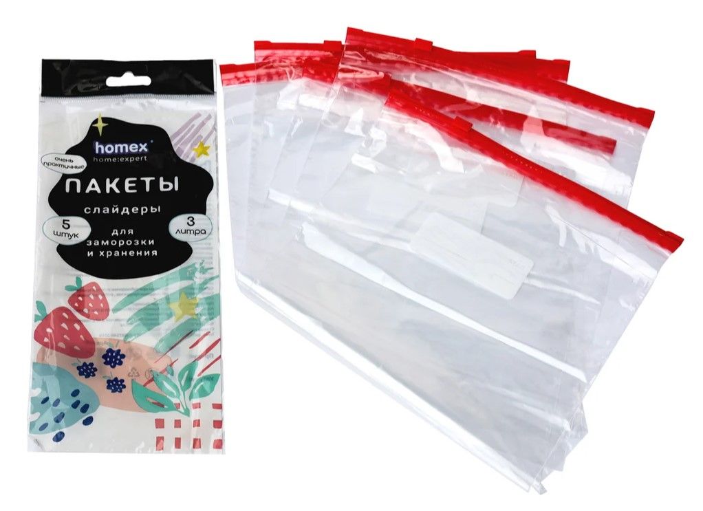 Пакеты слайдеры Homex очень практичные, 3 л, 5 шт.Модель может стать оптимальным вариантом для долговременного хранения мясных и рыбных продуктов, а также различных фруктов, ягод, зелени и грибов.