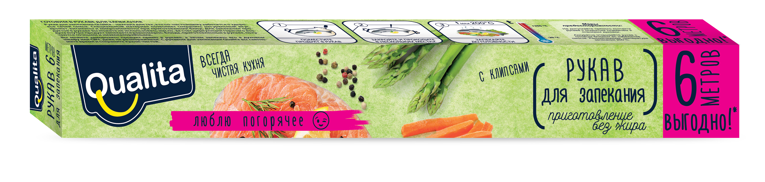 Qualita рукав для запекания 6 мПри запекании в рукаве продукт сохраняет натуральный вкус, аромат, витамины и макроэлементы. За счет циркуляции горячего воздуха запекание происходит равномерно и блюда получаются сочными и низкокалорийными.