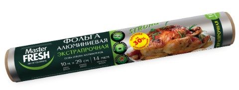 Master FRESH фольга алюминиевая экстрапрочная 10 метров 14мкм ролик для гриляЭкстра прочная алюминиевая фольга Master FRESH подходит для запекания, упаковки и хранения продуктов. Сохраняет свежесть и полезные свойства продуктов, а также не допускает смешивания запахов при хранении пищи. Толщина 14 мкм позволяет использовать фольгу даже на гриле. Изготовлена из безвредного материала для человека и окружающей среды. Высокая жаропрочность – до 230°C.