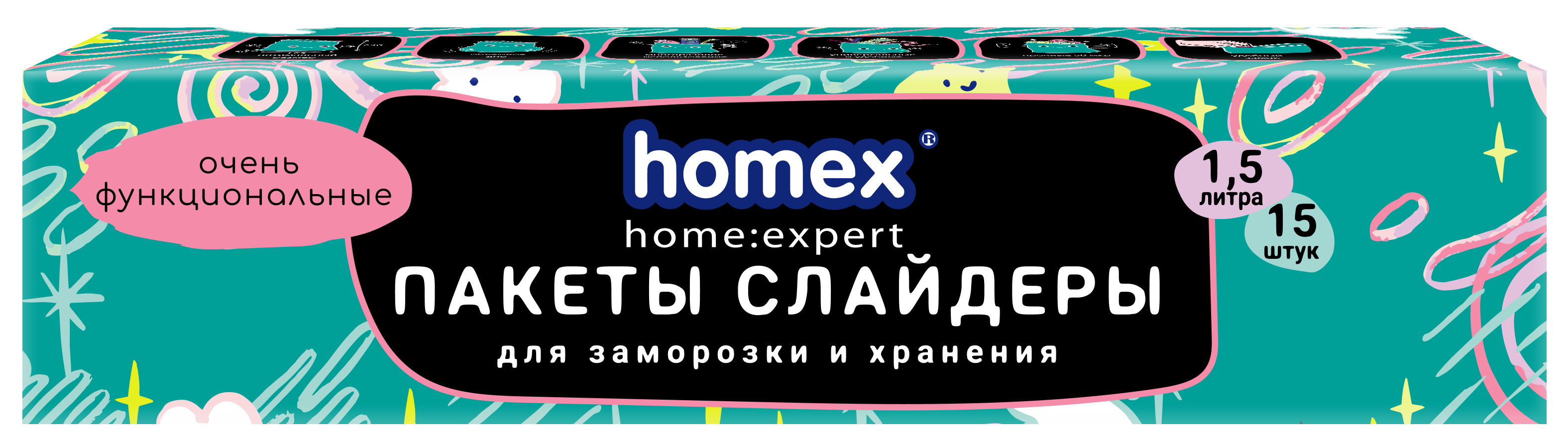 Homex пакеты слайдеры очень функциональные 1,5 литра 15 штукПакеты слайдеры ТМ НОМЕХ «ОЧЕНЬ ФУНКЦИОНАЛЬНЫЕ»Предназначены для хранения и заморозки продуктов питания. Идеально подходят для хранения сыпучих продуктов и заморозки овощей, фруктов, полуфабрикатов и готовых блюд в морозильной камере.В упаковке 15шт пакетов, объемом 1,5литра (размер: 24см х 17,5см). Объемное дно 50мм. Плотность пакета 50 мкр. Пакет с рисунком, 8 цветов, полноцветная печать! Пакеты продаются в коробке с перфорацией - удобно хранить дома! Пакеты герметичны, просты в использовании, надежно защищают продукты от посторонних запахов.