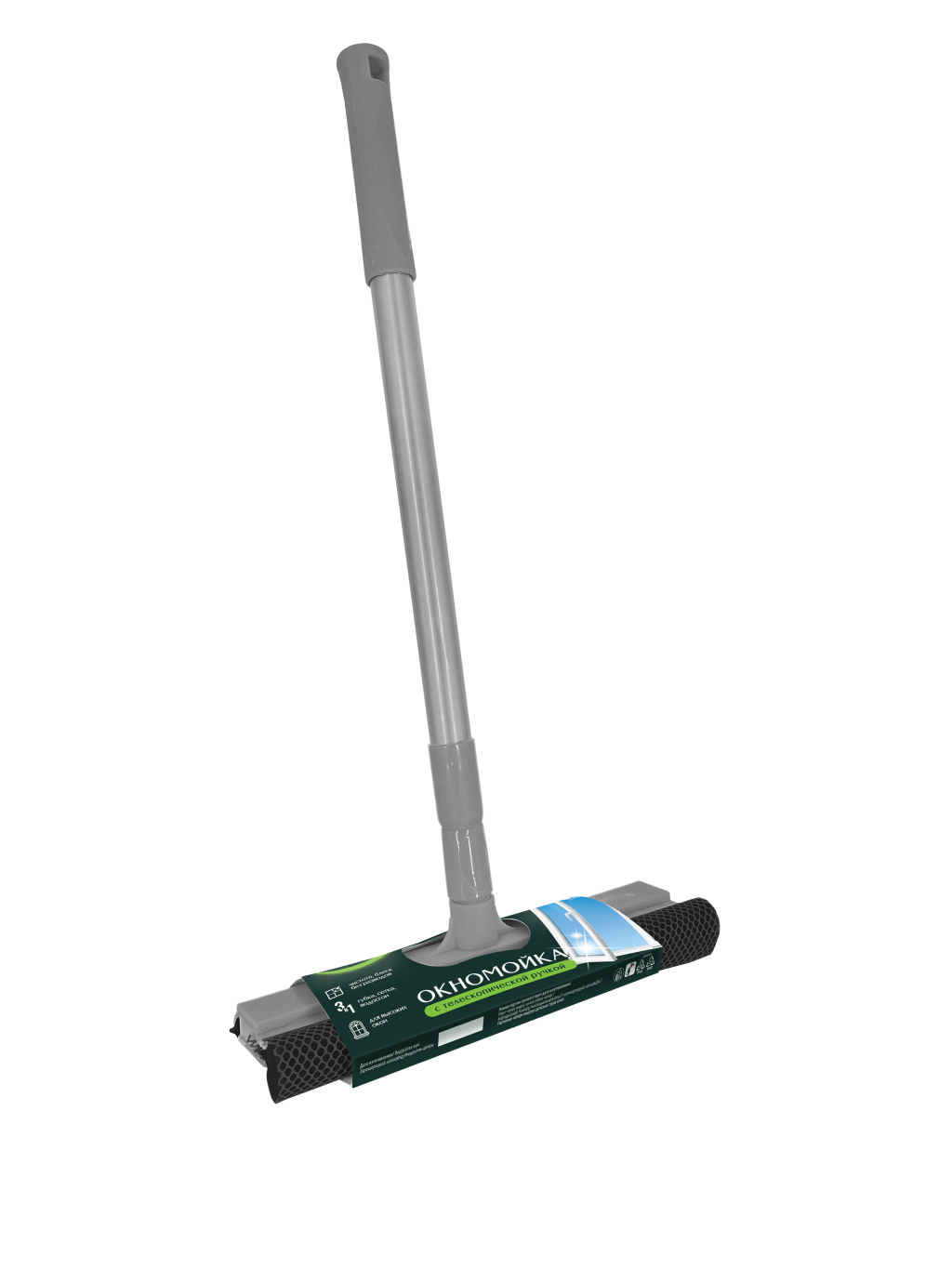 Master FRESH окномойка с телескопической ручкой 3в1 губка салфетка скребок 1штОкномойка с телескопической ручкой Master Fresh предназначена для качественной и удобной мойки окон, зеркал, керамической плитки и других поверхностей. Её можно использовать дома, на даче, в офисе и автомобиле. После мытья окон, поверхность становится чистой и сверкающей. Окномойка снабжена скребком из качественной резины, не твердеющей при низких температурах и губкой из плотного поролона покрытого синтетической сеткой, стойкой к истиранию, имеет телескопическую ручку для труднодоступных мест. Телескопический черенок позволяет менять длину изделия от 52 до 81 см. Сменная насадка - окномойка прослужит долго. Легкая конструкция, палка изготовлена из высокого качества российской стали повышенной прочности и толщины. К окномойке подходит палка от швабры Master FRESH, можно мыть очень высокие окна, например на балконе или с обратной стороны квартиры без особого труда и опасности для Вашего здоровья. Предусмотрено отверстие на кончике палки, можно повесить на стену и скрыть от посторонних глаз.