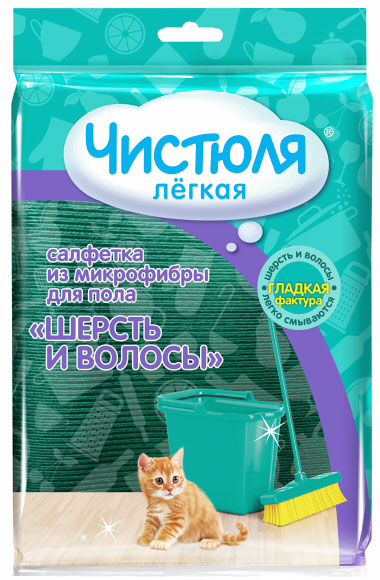Чистюля Легкая салфетка из микрофибры для пола шерсть и волосы 1 штСпециальная гладкая фактура: не вцепляются в салфетку и легко смываются водой. Очищает от ЖИРА и ГРЯЗИ без моющих средств. Очищают одним движением, не нужно протирать несколько раз. Особо стойкие загрязнения требуют небольшого количества моющего средства. Вытирают насухо, не оставляя следов и грязных разводов. Удаляют с поверхности даже микроорганизмы. Размер: 60 х 70 см.