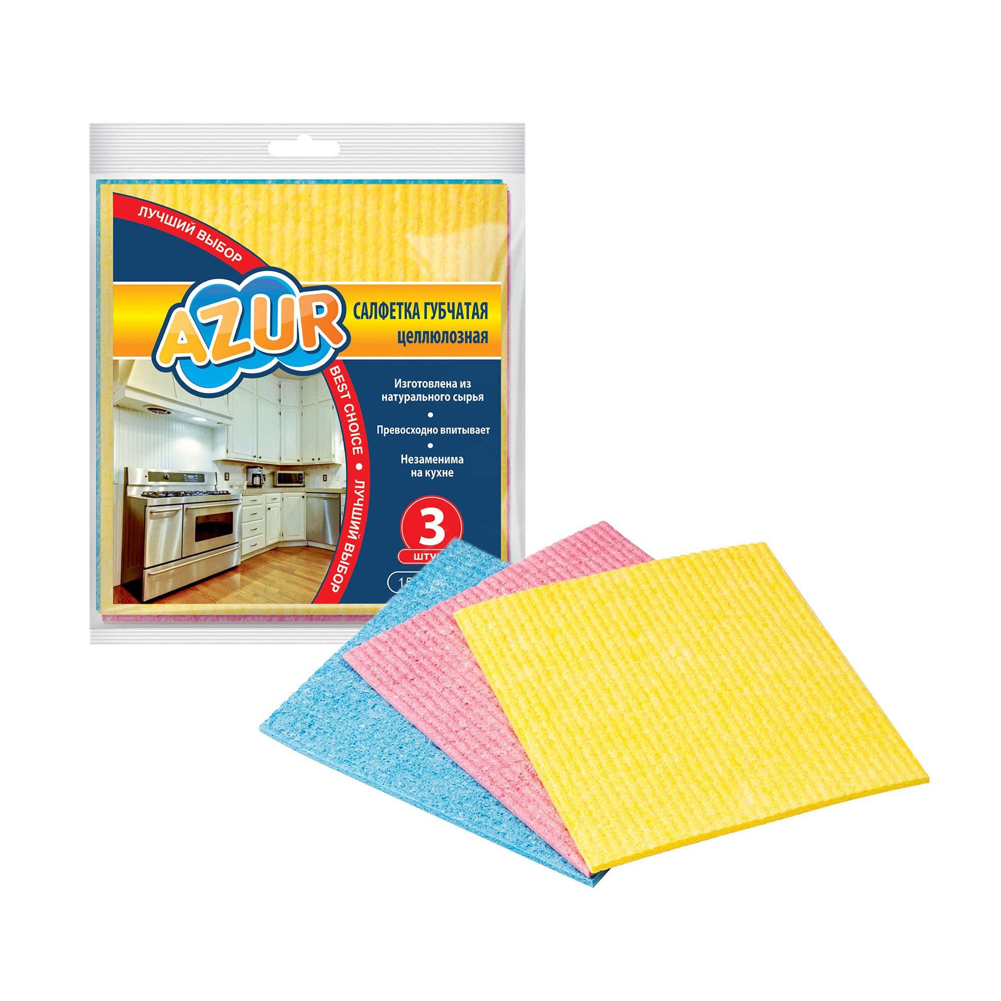 Azur салфетка губчатая 3 шт 14*16 смКлассическая губчатая салфетка незаменима на кухне или в ванной комнате! Отлично впитывает влагу, легко выжимается и быстро сохнет, поэтому не накапливает неприятных запахов. Кухонная салфетка-губка имеет небольшой размер, благодаря чему удобно лежит в руке. Салфетки имеют разные цвета, благодаря чему можно одновременно использовать несколько губчатых салфеток для разных нужд. Возможно применение только во влажном состоянии.