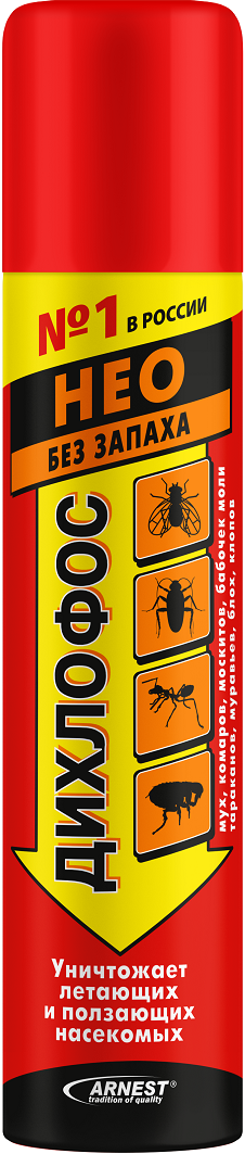 Арнест дихлофос нео 190 см3Уничтожает все виды бытовых насекомых: мух, комаров, тараканов, муравьёв, бабочек моли, клопов, блох и других.Создаёт защитный барьер на обработанных поверхностях, действует до 2-х недель.