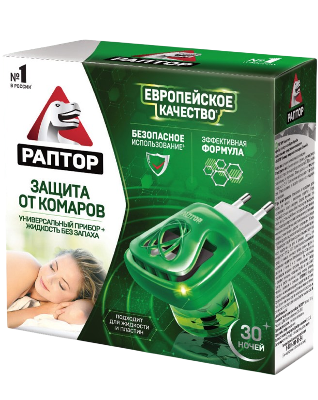 Раптор комплект прибор жидкость от комаров 30 ночейКомплект РАПТОР (универсальный прибор + жидкость) - средство от комаров в розетку N1 по продажам в летнем ассортименте бренда. Формула успеха РАПТОР проста и базируется на трёх китах: