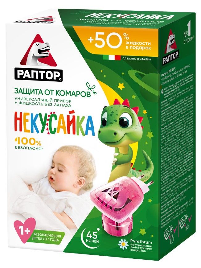Раптор некусайка комплект прибор жидкость от комаров 45 ночей для детейКогда в семье появляется малыш, приоритеты родителей смещаются в сторону обеспечения максимально комфортных и безопасных условий его жизни. РАПТОР поддерживает такой подход и представляет вашему вниманию детскую линию средств защиты от комаров РАПТОР НЕКУСАЙКА, специально разработанную для малышей и официально разрешённую к использованию с первого года жизни.