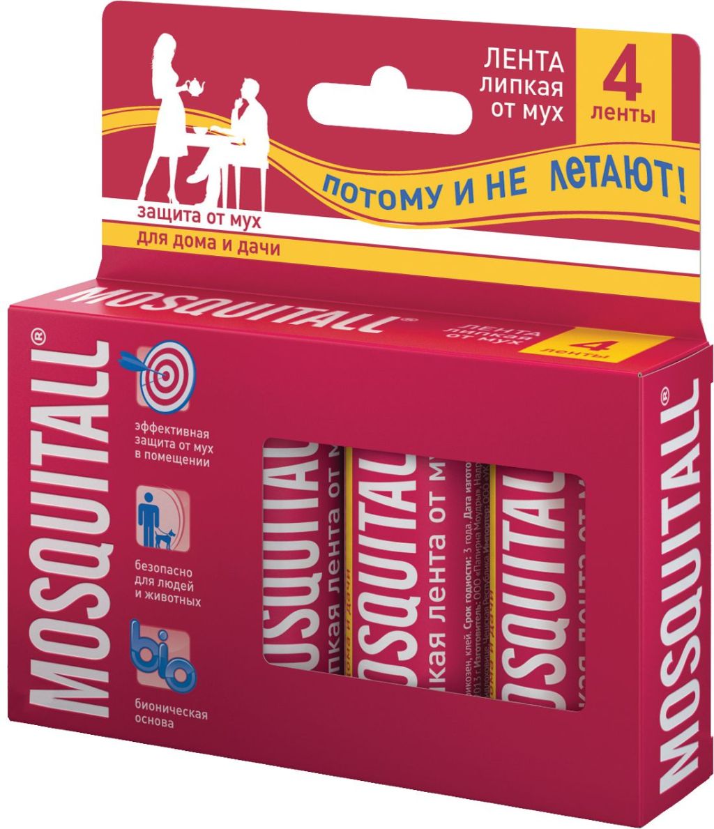 Mosquitall липкая лента 4 шт от мухЛипкая лента является одним из наиболее простых, удобных и эффективных средств борьбы с мухами в помещениях. Средство рассчитано на длительный срок использования и максимально безопасно для человека и окружающей среды. Принцип действия: половой аттрактант привлекает мух, и они приклеиваются к поверхности ленты