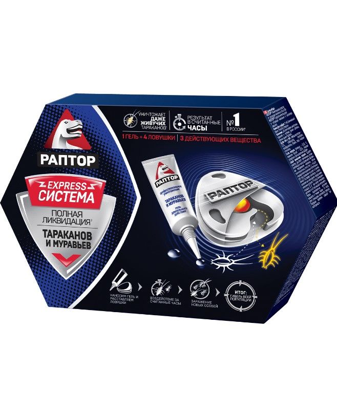 Раптор 4 ловушки гель система ликвидации тараканов и муравьевЕсли метод проб и ошибок - не для вас, если вы - сторонник системного подхода и ищете простое и быстрое решение проблемы с домашними насекомыми - вы на правильном пути. Навсегда избавиться от тараканов и муравьёв вам поможет специально разработанная Система ликвидации РАПТОР: 4 ловушки + гель. Благодаря комплексному воздействию, это непревзойдённое комбо справится даже с резистентными тараканами, невосприимчивыми к традиционным инсектицидам. Плюс обеспечит пролонгированную защиту вашего дома от новых вторжений на период до 6 месяцев! Ловушки для тараканов и муравьёв необходимо разместить в местах их массового скопления. В состав формулы ловушки входят два высокоэффективных действующих вещества нервнопаралитического действия. Они целенаправленно уничтожают все виды домовых тараканов и при этом абсолютно безопасны для человека. Гель предназначен для обработки труднодоступных мест, где могут прятаться насекомые - трещин в напольных покрытиях, щелей вдоль плинтусов и т. д. В его состав также входит современное активное вещество - инсектицид широкого спектра, обладающий контактным, кишечным и нервнопаралитическим действием, вызывающим гибель насекомых в течение суток после контакта с обработанной поверхностью. ВАЖНО! Не рекомендуется одновременное использование аэрозоля от насекомых вместе с гелем и ловушками, поскольку аэрозоль отпугивает особей от геля и приманки. Раптор-эффект: насекомых нет! Секрет популярности экспресс-системы РАПТОР от тараканов и муравьёв:- Профессиональная защита от самых распространённых домашних насекомых- Благодаря ТРЕМ ДЕЙСТВУЮЩИМ ВЕЩЕСТВАМ, Раптор способен победить даже резистентных тараканов, адаптировавшихся к привычным инсектицидным препаратам- До 6 месяцев эффективного действия.