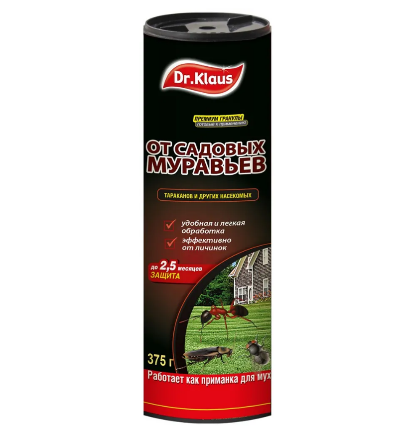 Dr.Klaus гранулы от муравьев и других насекомых банка 375 гдля уничтожения садовых муравьев, тараканов и мух • ГРАНУЛЫ ДЕЙСТВУЮТ ДО 75 ДНЕЙ • Гибель насекомых уже через 1-2 суток. • Для уничтожения муравьев, • Удобство в применении - гранулы можно рассыпать в самых труднодоступных местах, трещинах и щелях. • Средство можно использовать как внутри помещений, так и снаружи
