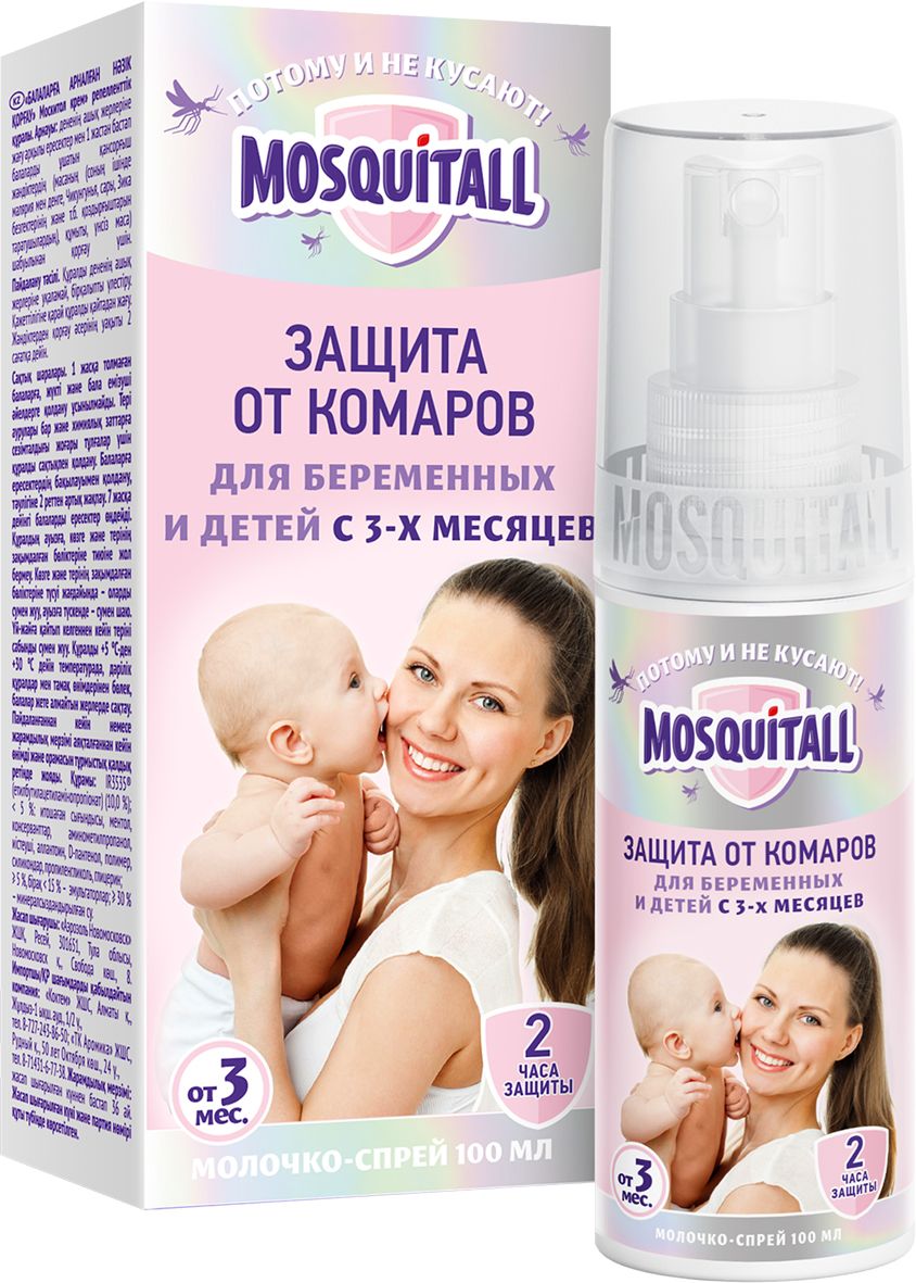 Mosquitall молочко спрей нежная защита для младенцев от 3 мес и беременных 100 млМолочко-спрей от комаров Mosquitall "Нежная защита для младенцев от 3 мес. и беременных" 100 мл - УНИКАЛЬНЫЙ продукт, подходит для младенцев от 3-х месяцев и беременным женщинам. Молочко-спрей надежно защитит Вашего малыша от укусов комаров, мошек, мокрецов и москитов во время прогулок. В состав средства входит 10% – действующее вещество нового поколения, самый безопасный из существующих репеллентов. Он является производным природной аминокислоты аланина и относится к БИО-репеллентам, не обладает запахом и не оставляет ощущения липкости на коже. Молочко-спрей 2 в 1 не только эффективно отпугивает комаров, но смягчает и увлажняет нежную кожу ребенка, а также снимает неприятные ощущения и зуд после укусов, способствует исчезновению покраснений, вызванных укусами насекомых. Входящие в состав: - ПАНТЕНОЛ – увлажняет кожу; - АЛЛАНТОИН – способствует регенерации кожи; - МЕНТОЛ - снимает раздражение и зуд. • Время защитного действия: до 2 часов • Разрешено к применению для детей от 3-х месяцев и для беременных женщин • Незаменимо для людей с особо чувствительной кожей • Без парабенов • Не оставляет следов на одежде; • Обладает приятным нежным ароматом