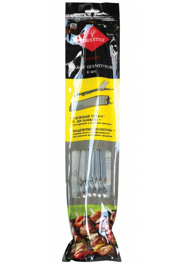 Forester набор шампуров малых в блистере 6 шт никел сталь экономНабор шампуров малых Forester в пакете с zip-lock RZ-450SB, 6 штук изготовлен из качественной нержавеющей стали, при минимальном уходе долго сохраняет первоначальный вид. Классическая конструкция позволяет надежно фиксировать на шампурах мясо или овощи, а винтовая форма ручек предотвращает произвольное проворачивание продукта вдоль оси. Это дает возможность контролировать равномерную прожарку шашлыка. Благодаря хорошей упругости металла, изделия выдерживают даже крупные куски мяса.Набор шампуров Форестер поставляется в пакете с zip-lock замком. Это защищает металлические инструменты от воздействий окружающей среды, а также обеспечивает их комфортное хранение и перевозку. Предлагаем купить набор шампуров для шашлыка не только для личного пользования, но и в подарок друзьям.