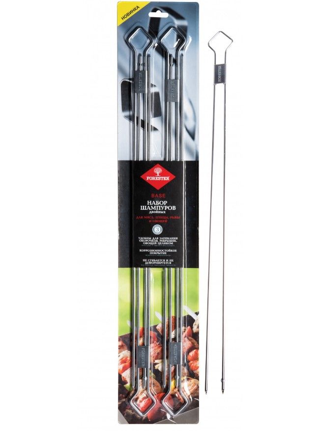 Forester двойные шампуры для крупных кусков мяса 4 шт в набореV-образная конструкция двойных шампуров Forester RZ-500UB удобна для равномерной прожарки куриных ножек и окорочков, рыбы, ребрышек и овощей целиком. Однако и мелкие продукты, такие как креветки или тонко порезанные овощи, готовить будет несложно. Двойной шампур надежно фиксирует приготавливаемый на гриле продукт, чтобы он не вращался при переворачивании. Поэтому вам будет легко контролировать процесс обжарки с двух сторон, не беспокоясь о том, что ингредиенты могут неравномерно прожариться или провалиться на угли.