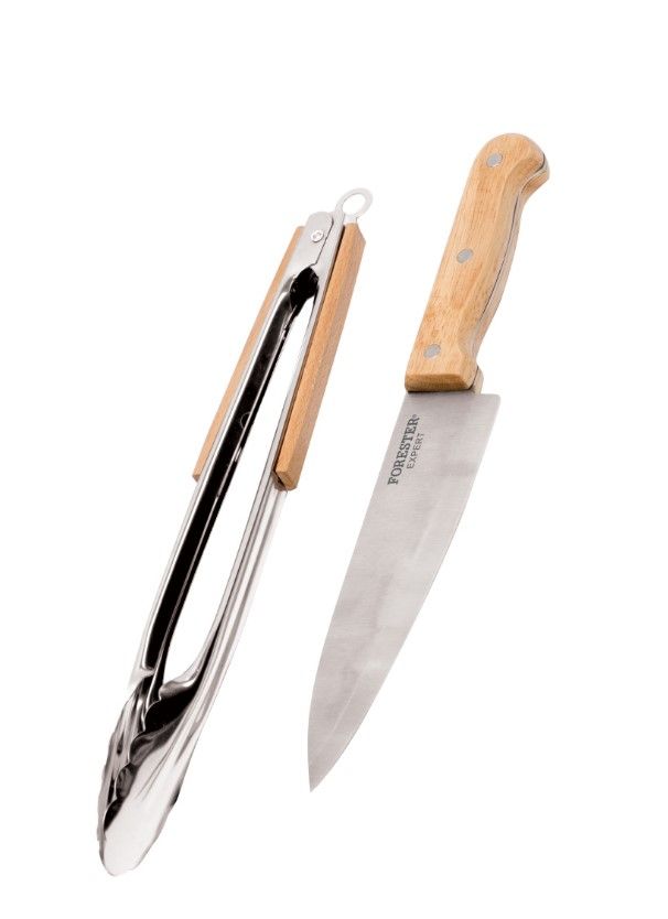 Forester универсальный набор для гриля щипцы нож шефаИспользуется при приготовлении гриль-блюд и других продуктов; щипцы имеют замок для фиксации угла раскрытия; острое лезвие универсального ножа прекрасно справляется с любым мясом, птицей, рыбой, овощами; высококачественная нержавеющая сталь AISI 420 долговечна в использовании; рукоятки из бука подходят для мытья в посудомоечной машине, дерево не рассыхается. В комплект входят: Нож длиной 30 см - 1 шт. Щипцы длиной 31 см - 1 шт.