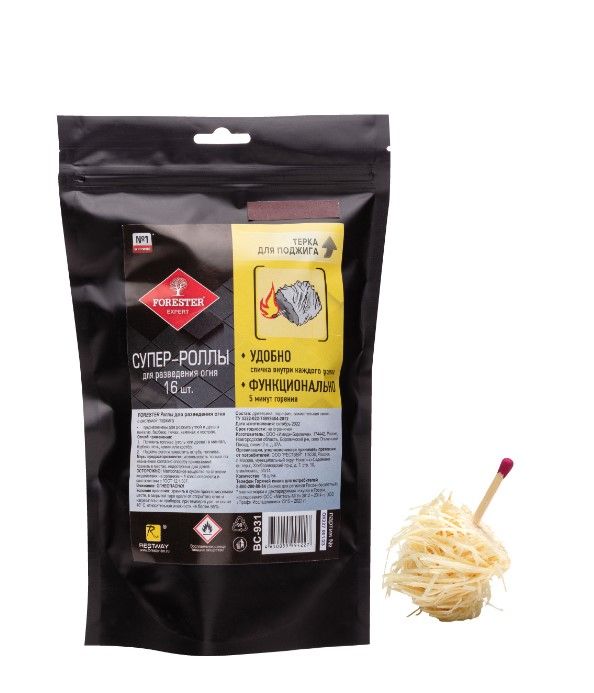 Forester супер роллы набор для разведения огня 16 штFORESTER Супер-роллы, набор для разведения огня, 16 шт предназначены для розжига углей и дров в мангалах, барбекю, печах, каминах и кострах. 5 минут горения. Спичка внутри каждого ролла. 16 роллов в упаковке.