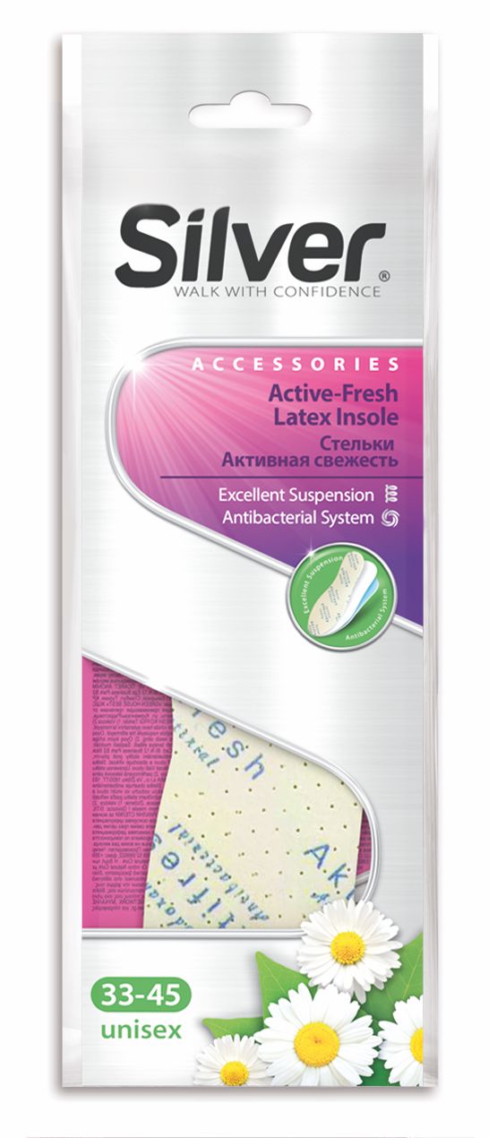Silver стельки всесезонные парфюмированные с добавкой антибактериального веществаПористая структура способствует циркуляции воздуха внутри обуви и поглощению влаги. Слой из антибактериального латекса с активированным углем впитывает влагу и неприятные запахи. Дезодорированный латекс обеспечивает приятную свежесть в обуви в течение всего дня.Способ применения: Обрежьте стельку по отпечатанной на поверхности линии в соответствии с вашим размером обуви. Вставьте стельку внутрь обуви, вискозной стороной вверх. В конце дня просушить при комнатной температуре. Меры предосторожности: Рекомендуется менять 1 раз в месяц. Стельки не рекомендуется стирать. До использования хранить в оригинальной упаковке при относительной влажности не выше 75%