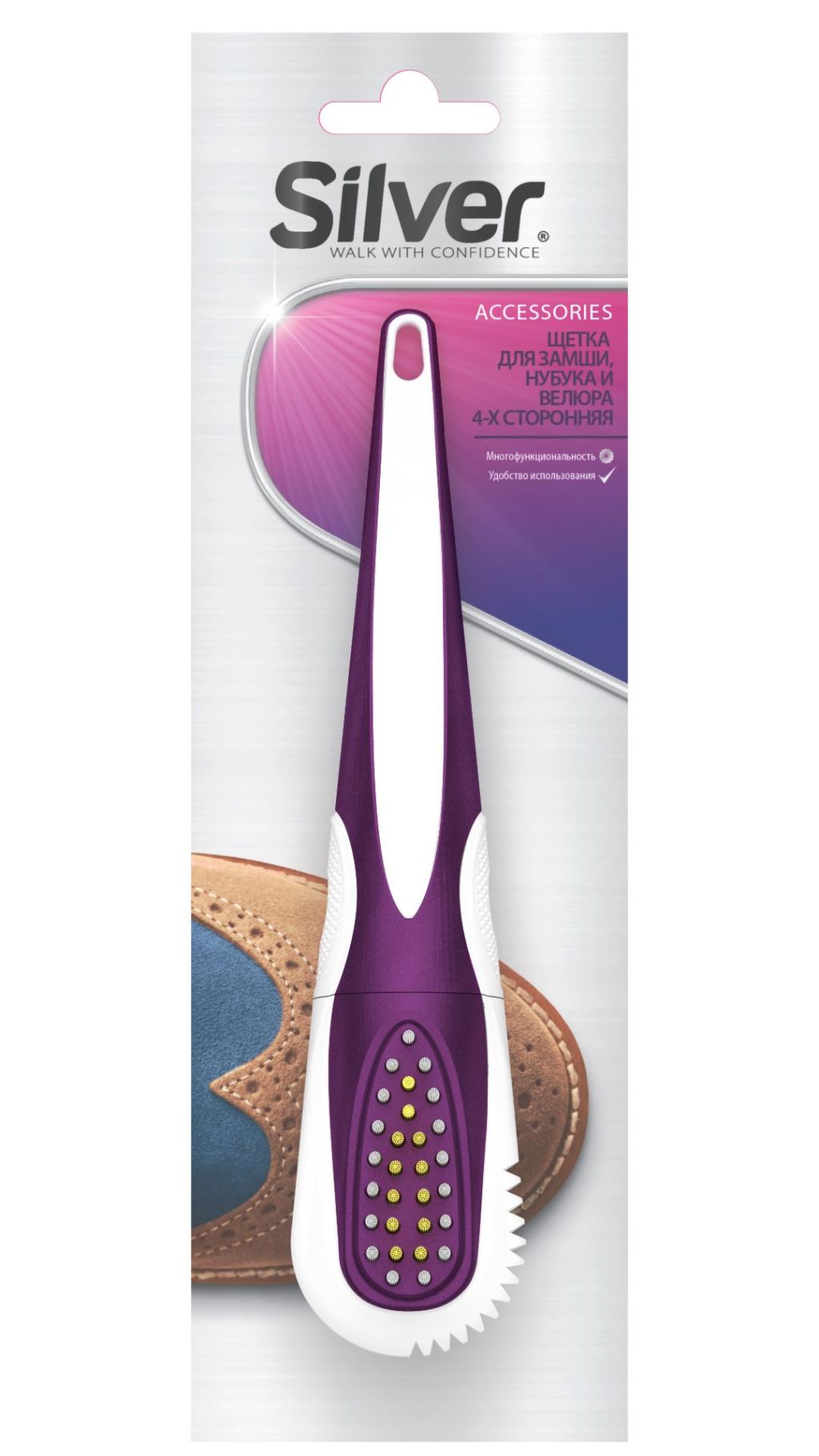 Silver щётка для обуви для нубука и замши 4-х сторонняяЩетка для замши, нубука и велюра.Эффективно удаляет сильные загрязнения с поверхности ворсовой кожи и устраняет засаленности, поднимает ворс. Способ применения:высушите поверхность изделия. Очистите сильные загрязнения латунной-ворсовой стороной щетки с легким нажимом. Боковыми ребрами удалите загрязнения со швов и рантов. Каучуковой стороной щетки поднимает ворс, проведя по поверхности изделия в одном направлении. Меры предосторожности: Старайтесь не поцарапать поверхность чрезмерным воздействием.