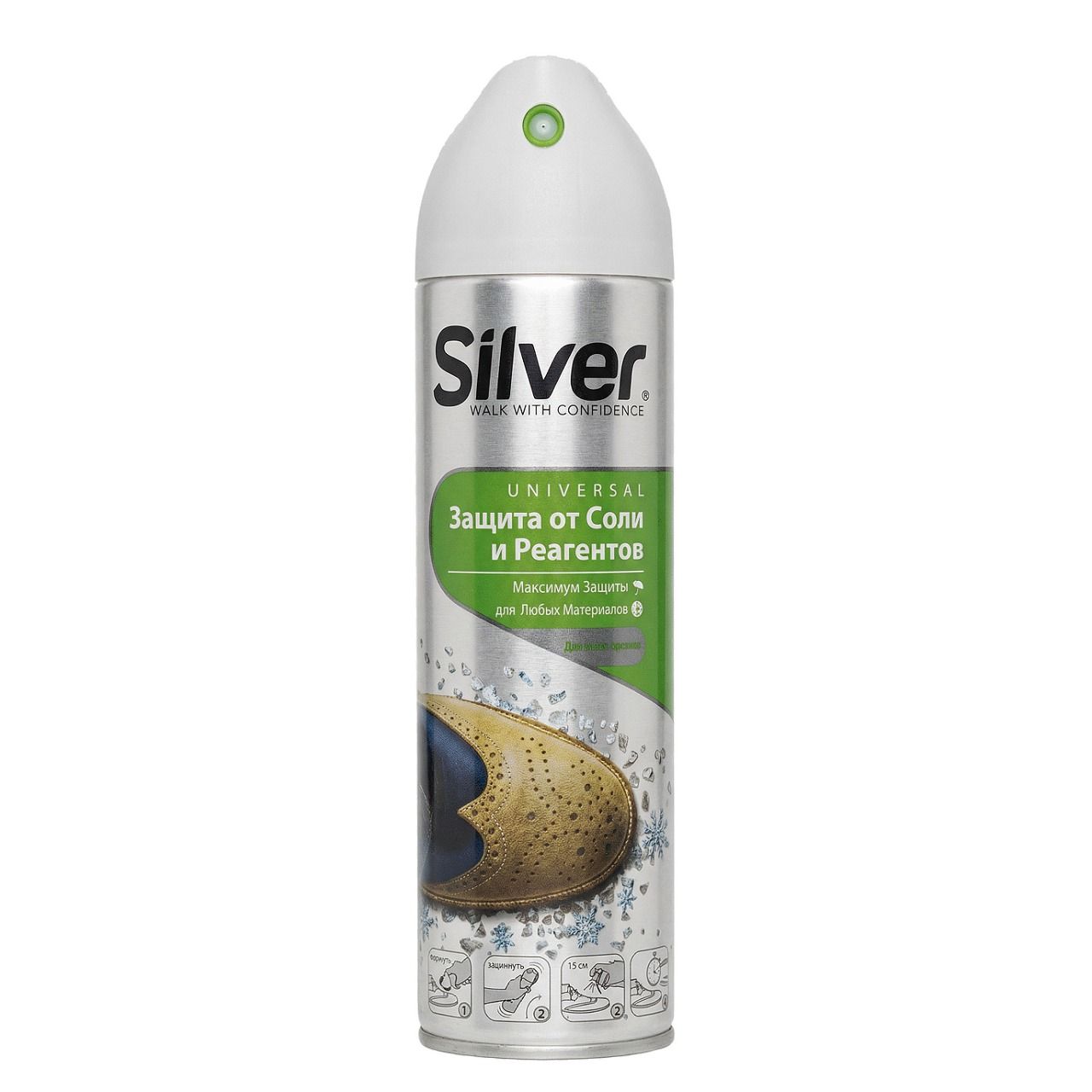 Silver спрей защита от соли и реагентов для всех цветов и видов кожи и текстиля 250 млСпециально разработан для обеспечения длительной защиты от солевых разводов, реагентов, снега, воды и грязи. Подходит для изделий из всех видов кожи, текстиля, синтетики, замши и нубука. Способ применения: Очистите поверхность изделия щеткой расположенной на крышке флакона. Встряхите баллон. Распылите средство по поверхности сухого изделия с расстояния 15-20 см., держа баллон вертикально распылителем вверх. Дайте высохнуть. Меры предосторожности: Использовать только по назначению согласно инструкции вне помещения или в хорошо проветриваемом помещении. Не вдыхать! Не распылять вблизи открытого огня и раскаленных предметов. Баллон под давлением: предохранять от воздействия солнечных лучей и нагревания выше 50°С. Не разбирать и не сжигать баллон, даже после использования. Не курить. Избегать попадания в глаза и на кожу. При попадании в глаза и на кожу промыть большим количеством воды с мылом. Хранить в недоступном для детей месте, вдали от источников тепла/искр/открытого огня/горячих поверхностей при температуре от +5°С до +35°С. После использования пустой баллон утилизировать как бытовые отходы.