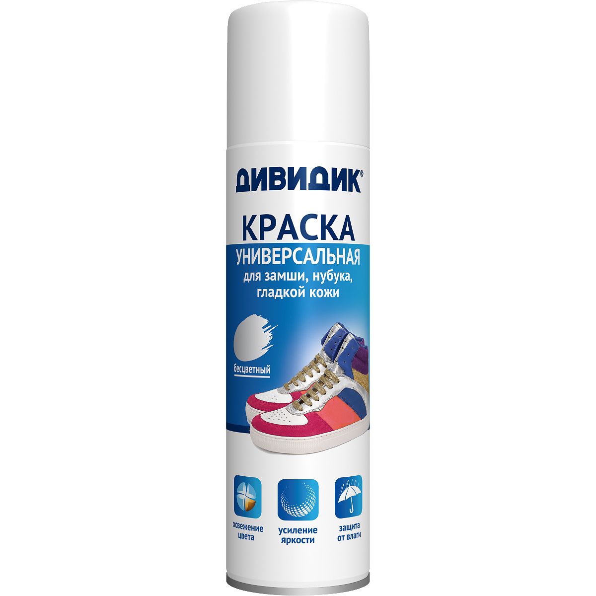 Дивидик аэрозоль для обуви универсальная краска бесцветная 250 млКраска универсальная подходит для изделий всех цветов из гладкой кожи, замши, нубука, велюра, а также комбинированных материалов.