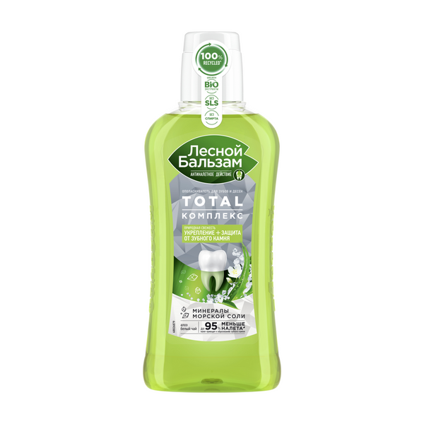 Лесной бальзам ополаскиватель для полости рта total комплекс природная свежесть с алоэ и белым чаем 400 млПопробуй новый ополаскиватель Лесной бальзам TOTAL Комплекс с морской солью, соком алоэ и экстрактом белого чая. Формула ополаскивателя на 98% состоит из ингредиентов натурального происхождения, интенсивно очищает зубы от налета, защищает от зубного камня и препятствует развитию кровоточивости десен, обеспечивая комплексную защиту всей полости рта. Формула ополаскивателя TOTAL Комплекс борется с первопричиной развития серьезных проблем полости рта – зубным налетом, который вызывает кариес, влияет на изменение цвета зубов, приводит к образованию зубного камня и кровоточивости десен. Формула ополаскивателя усилена минеральными компонентами и экстрактами трав, не содержит парабенов и спирта, имеет самый мягкий вкус в линейке Лесной бальзам и рекомендована стоматологами для ежедневного использования: • морская соль защищает от бактерий и помогает предотвратить разрушающее действие налета на эмаль зубов; • сок алоэ и экстракт белого чая укрепляют десны, защищают от кровоточивости. Используй ополаскиватель Лесной бальзам TOTAL Комплекс после каждой чистки зубов и избавься от налета в два счета! Он поможет значимо улучшить домашнюю гигиену полости рта, а именно1: • лучше очищать зубы от налета и качественно прочищать межзубные промежутки • сохранять ощущение чистых зубов дольше за счет снижения скорости появления налета на зубах; • защищать от образования зубного камня; •