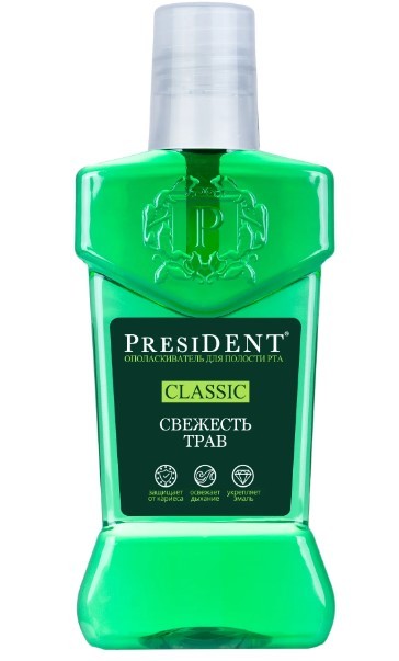 President ополаскиватель classic свежесть трав 250 млОполаскиватель PRESIDENT Classic свежесть трав прекрасно освежает полость рта, укрепляет эмаль и служит дополнительной профилактикой кариеса. в состав продукта входят активные компоненты: 1) Фтор - укрепляет эмаль. 2) Ксилитол- подавляет рост бактерий. 3)Ромашка и шалфей - уменьшают воспаление. Без SLS. Ополаскиватель обладает деликатным антибактериальным действием, придает длительную свежесть дыханию. Является эффективным дополнением к зубной пасте PresiDENT Classic для полноценной гигиены полости рта. При разбавлении 1:5 может быть использован как жидкость для ирригатора. Проникает в самые труднодоступные участки. Не содержит спирт.