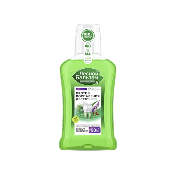 Лесной бальзам ополаскиватель на отваре трав с шалфеем против воспаления десен 250 млПрофилактический ополаскиватель Лесной бальзам на отваре трав с шалфеем - эффективное средство для полоскания десен с выраженным противовоспалительным эффектом. Он обладает иммунноактивным действием и в 2 раза улучшает работу собственного иммунитета полости рта, снижая риск развития проблем с деснами*. Клинически-доказанный эффект: - С первого применения исчезает болезненность десен* - До 94% снижает воспаление десен при регулярном использовании** - В 5 раз снижает скорость образования налета на зубах, уменьшая бактериальную нагрузку на мягкие ткани полости рта** - не нарушает баланс микрофлоры полости рта Особенности состава: Насыщенный хвойный вкус. Содержит хвойных комплекс (на основе экстрактов пихты, живицы, можжевельника) с отваром 5 целебных трав, экстрактом шалфея, маслом кедровых орешков и соком алоэ. Такой сбалансированный состав способствует снижению воспаления и отечности десен, блокирует развитие воспалительного процесса и стимулирует восстановление мягких тканей полости рта.