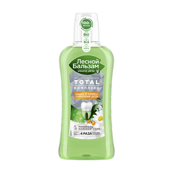 Лесной бальзам ополаскиватель для полости рта total комплекс с морской солью, ромашкой и облепихой 400 млПопробуй новый ополаскиватель для комплексной защиты зубов и десен – Лесной бальзам TOTAL Комплекс с морской солью, экстрактом ромашки и маслом облепихи, в составе которого 98% ингредиентов натурального происхождения. Формула ополаскивателя TOTAL Комплекс борется с первопричиной развития серьезных проблем полости рта – зубным налетом, который вызывает кариес, влияет на изменение цвета зубов, приводит к образованию зубного камня и появлению кровоточивости десен