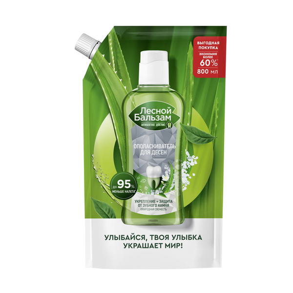 Лесной бальзам природная свежесть ополаскиватель для десен с морской солью, соком алоэ и экстрактом белого чая 800 мл дой пакЛесной Бальзам Природная свежесть — ополаскиватель для десен с натуральными ингредиентами и приятным мягким вкусом, предназначенный для комплексной гигиены полости рта от кариеса. Формула средства на 98% состоит из компонентов натурального происхождения и усилена минералами и экстрактами трав: Минералы морской соли помогают укрепить зубную эмаль и предотвратить разрушающее действие налета на зубы и десны. Сок алоэ и экстракт белого чая поддерживают здоровье десен. В составе нет спирта. Ополаскиватель для полости рта борется с зубным налетом, который является первопричиной развития многих стоматологических проблем и влияет на изменение цвета зубов. Средство действует сразу в нескольких направлениях: Позволяет удалить остатки налета в труднодоступных для щетки местах. Защищает от зубного камня, вызывающего кровоточивость десен. Снижает скорость повторного появления налета до 95%* и надолго сохраняет ощущение чистых зубов. Способствует укреплению зубов и десен. Ополаскиватель для зубов подходит для ежедневного использования. Также его можно применять для усиленной гигиены при ношении брекетов и съемных зубных протезов — средство обеспечит дополнительную защиту от развития кариесогенной микрофлоры и локальных очагов воспаления.