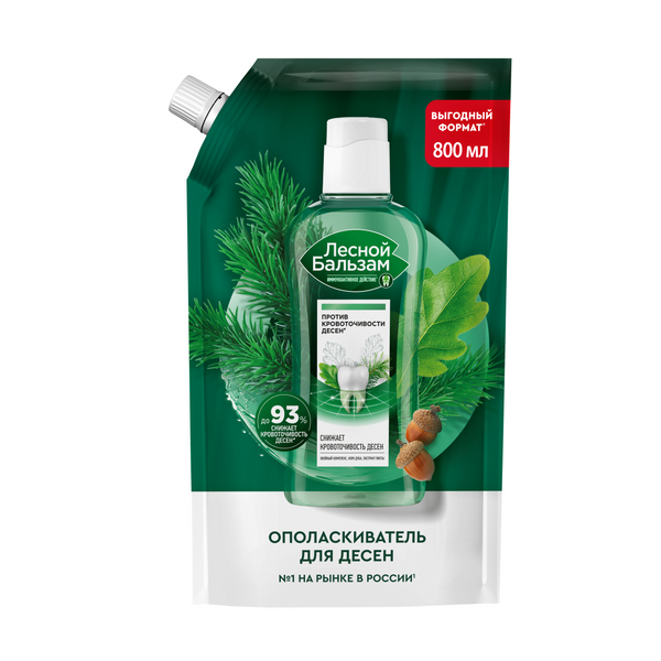 Лесной бальзам ополаскиватель для десен кора дуба 800 млДля ежедневного ухода за полостью рта попробуй профилактический Лесной бальзам c иммуноактивным действием* в выгодном° формате дойпак. Ополаскиватель эффективно борется с кровоточивостью десен; поддерживает естественную микрофлору полости рта*; снижает риск развития проблем с деснами. Формула ополаскивателя включает в себя CPC technology и экстракты трав, не содержит спирта и рекомендована стоматологами для ежедневного использования: • Отвар трав поддерживает естественную микрофлору полости рта*; • Высокоэффективный поливитаминный хвойный комплекс оказывает выраженное противовоспалительное действие на ткани пародонта; • Живица оказывает антиоксидантный и тонизирующий эффект на десны. Клинически доказанный эффект**: • С первого применения улучшает состояние десен. • До 93% снижает кровоточивость десен при регулярном использовании. • В 5 раз снижает скорость образования налета на зубах, уменьшая бактериальную нагрузку на мягкие ткани полости рта. • Не нарушает баланс микрофлоры полости рта*. Формула ополаскивателя Лесной бальзам с экстрактами коры дуба и пихты на 97% состоит из компонентов натурального происхождения и имеет насыщенный хвойный вкус. Содержит хвойный комплекс (на основе экстрактов пихты и ели), отвар 5 целебных трав, экстракт коры дуба и сок алоэ.
