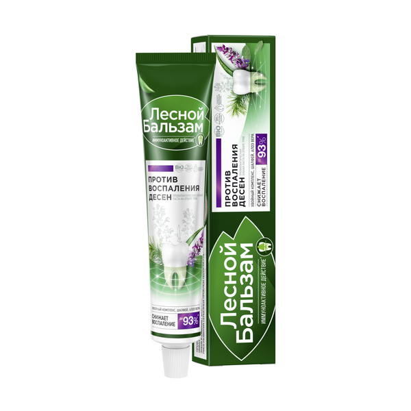 Лесной бальзам паста зубная на отваре трав с шалфеем и алоэ против воспаления десен 75 млПрофилактическая зубная паста Лесной бальзам на отваре трав c иммуноактивным действием помогает решить проблему воспаления десен и в 2 раза улучшает работу собственного иммунитета полости рта, снижая риск развития проблем с деснами*. Клинически-доказанный эффект: - С первого применения исчезает болезненность десен* - До 94% снижает воспаление десен при регулярном использовании** - В 5 раз снижает скорость образования налета на зубах, уменьшая бактериальную нагрузку на мягкие ткани полости рта** Особенности состава: Насыщенный хвойный вкус. Содержит хвойный комплекс (на основе экстрактов пихты, живицы, можжевельника) с отваром 5 целебных трав, экстрактом шалфея и соком алоэ. Богатый натуральный состав способствует снижению воспаления и отечности десен, блокирует развитие воспалительного процесса и стимулирует восстановление мягких тканей полости рта. Зубная паста изготовлена на отваре 5 трав (ромашка, тысячелистник, крапива, зверобой, чистотел). Отвар трав используется взамен обычной воды и получается в результате низкотемпературной экстракции (35%), что позволяет достичь максимально полного переноса ценных веществ из растений в отвар. Зубная паста бережно очищает эмаль за счет природного абразива - диоксида кремния (Silica).