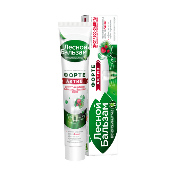 Лесной бальзам паста зубная на отваре трав форте актив 75 млПрофилактическая зубная паста Лесной бальзам Форте Актив содержит повышенную концентрацию натуральных экстрактов для усиленного восстановления десен. Лесной бальзам зубная паста усилена маслом чайного дерева и уже с первого дня активирует иммунитет полости рта*, повышая естественную защиту зубов и десен от вредных бактерий. Клинически-доказанный эффект*: 1) Эффективна с первого применения. 2) В 2 раза снижает воспаление и кровоточивость десен Особенности состава: 1) В состав зубной пасты входит хвойный комплекс с тройной концентрацией отвара трав и 8 фитоэкстрактов. Богатый растительный состав продукта способствует быстрому снижению воспаления и кровоточивости десен, улучшает питание мягких тканей полости рта. 2) Паста имеет насыщенный хвойный вкус с богатым вкусом ягод и лечебных трав. Цвет пасты обусловлен высоким содержанием натуральных экстрактов в составе. 3) Зубная паста изготовлена на отваре 5 трав (ромашка, тысячелистник, крапива, зверобой, чистотел). Отвар трав используется взамен обычной воды и получается в результате низкотемпературной экстракции (35%), что позволяет достичь максимально полного переноса ценных веществ из растений в отвар. 4) Зубная паста бережно очищает эмаль за счет природного абразива - диоксида кремния ().