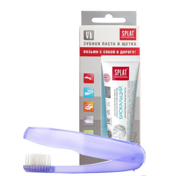 Дорожный набор Splat Professional Travel Kit BIOCALCIUM / БИОКАЛЬЦИЙВ дорожный набор входит: мини-упаковка (40 мл) зубной пасты СПЛАТ ПРОФЕССИОНАЛ БИОКАЛЬЦИЙ и складная зубная щетка.