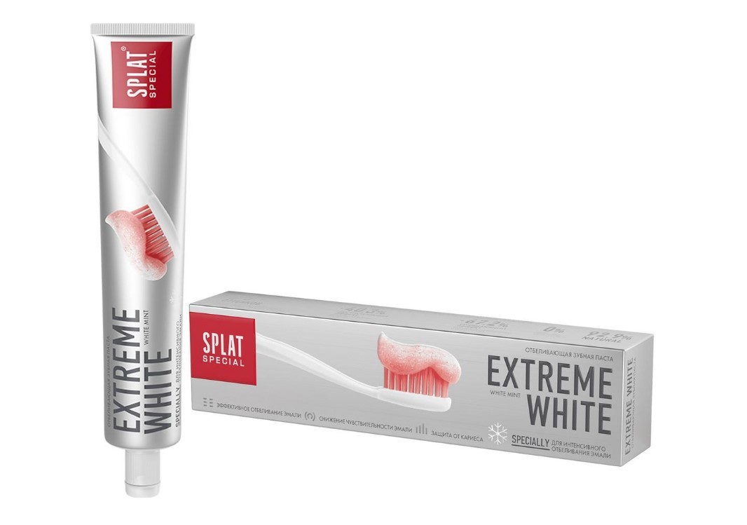Инновационная отбеливающая зубная паста СПЛАТ ЭКСТРИМ ВАЙТ содержит микрогранулы с пероксидом карбамида и уникальный отбеливающий комплекс Sp.White system®. Паста создана специально для мягкого отбеливания эмали в течение 4 недель ежедневного применения.