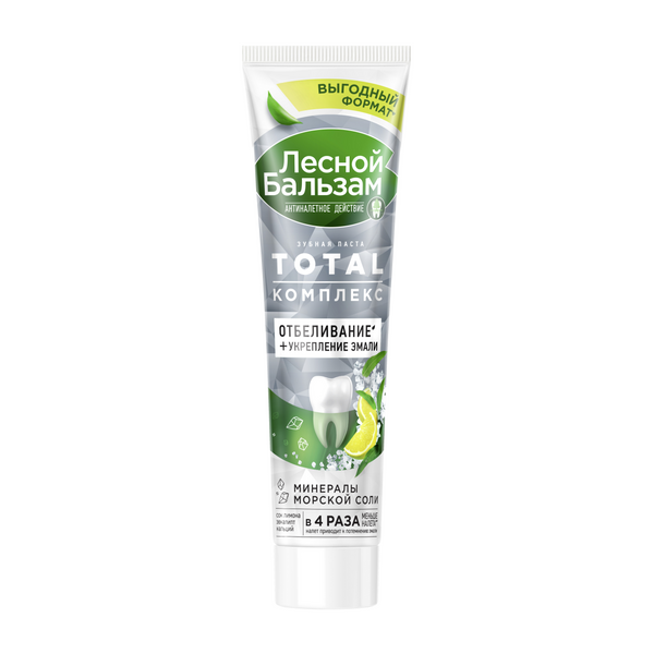 Лесной Бальзам зубная паста комплекс отбеливание с морской солью и лимоном 150 грО белых зубах, без темного налета и зубного камня, мечтает каждый! Попробуй новую зубную пасту для комплексной защиты полости рта с отбеливающим эффектом - Лесной бальзам Комплекс с морской солью, соком лимона и кальцием, в составе которой 95% ингредиентов натурального происхождения. Формула зубной пасты Комплекс обеспечивает усиленное очищение1 и борется с первопричиной развития серьезных проблем полости рта – зубным налетом! Зубная паста содержит на 50% больше очищающих частиц1, эффективно удаляет налет даже в межзубных промежутках, защищает от образования зубного камня и укрепляет эмаль, возвращая ей природную белизну и блеск. Клинически доказано: в 4 раза меньше налета, который приводит к потемнению эмали зубов!2 Формула зубной пасты усилена минеральными компонентами: морская соль защищает от бактерий и помогает предотвратить разрушающее действие налета на эмаль зубов, а кальций способствует укреплению эмали зубов. Сок лимона снижает активность вредных бактерий в полости рта. Бережное очищение эмали происходит за счет абразива природного происхождения – диоксида кремния (), который имеет округлую форму частиц и не царапает эмаль в процессе чистки, при этом позволяет добиться качественного удаления налета по всей поверхности зубов. Зубная паста не содержит парабенов и химических отбеливателей, рекомендована стоматологами для ежедневной защиты зубов и десен.