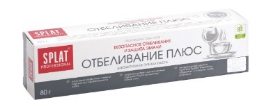 Splat professional зубная паста отбеливание плюс 80гЗубная паста SPLAT Отбеливание плюс – эффективная комплексная зубная паста, содержит инновационную систему для безопасного отбеливания Sp.White system, благодаря которой зубы становятся светлее на 1,5 тона за 4 недели использования. Ионы калия заботятся о зубах в случае их повышенной чувствительности. Идеально подходит любителям кофе, чая и тем, кто курит. Не повышает чувствительность зубов. Округлые полирующие частицы в сочетании с компонентом Polydon и натуральными ферментами из папайи заметно осветляют эмаль, расщепляют налет в труднодоступных местах и делают поверхность зубов идеально гладкой, что способствует сохранению белизны надолго. Ионы калия снижают повышенную чувствительность зубов. Натуральные антибактериальные компоненты препятствуют образованию налета и заботятся о свежести дыхания. Фторид-ионы эффективно защищают от кариеса.