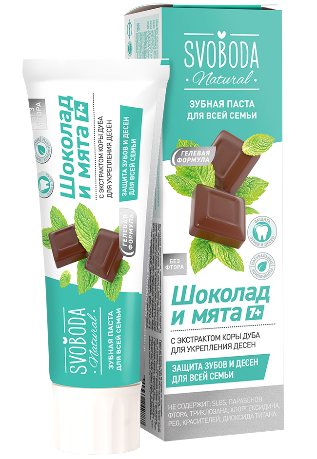 Svoboda зубная паста для всей семьи шоколад и мята 7 плюс 98 гЗубная паста SVOBODA Шоколад и мята содержит комплекс целебных компонентов. Кальция лактат – источник кальция, необходимого для укрепления зубной эмали. Кора дуба способствует поддержанию здоровья десен. Какао содержит комплекс витаминов, микроэлементов и антиоксидантов, которые способствуют поддержанию тонуса десен. Шоколадно-мятный вкус пасты превращает ежедневную процедуру в настоящее удовольствие для всей семьи.