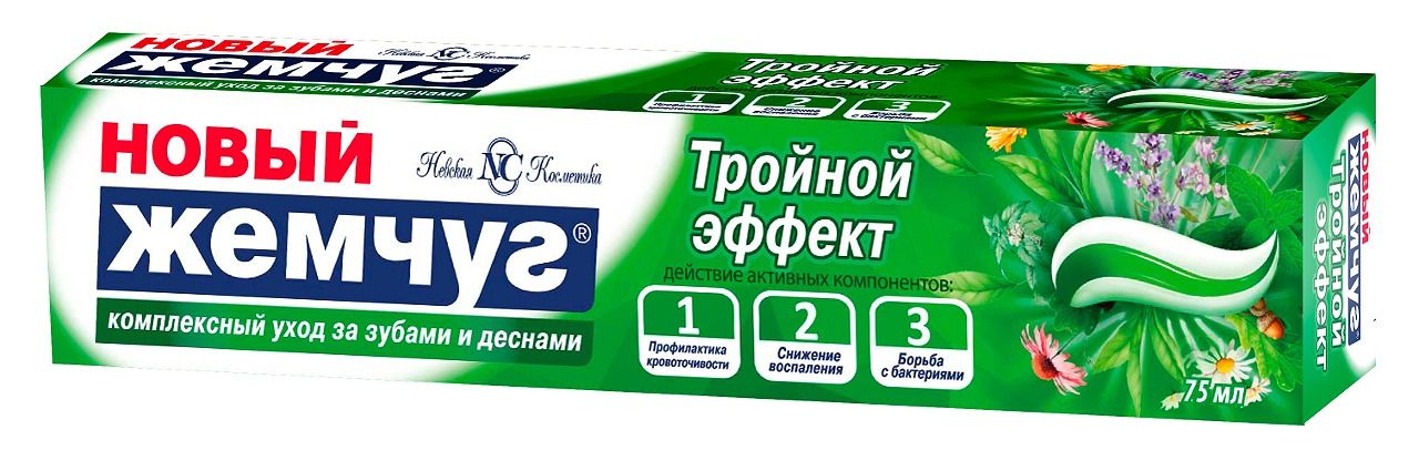 Новый Жемчуг зубная паста тройной эффект 75 млЗубная паста комплексного действия. Подходит для использования вcей семьей, включая детей от 14 лет. Комплексный уход за зубами и деснами, защищает от кариеса, реминерализует, сохраняет естественную белизну зубов, предотвращает ее пожелтение, препятствует образованию налета, содержит активный комплекс «кальций +фтор», активные компоненты подавляют рост зубного камня, освежает дыхание.