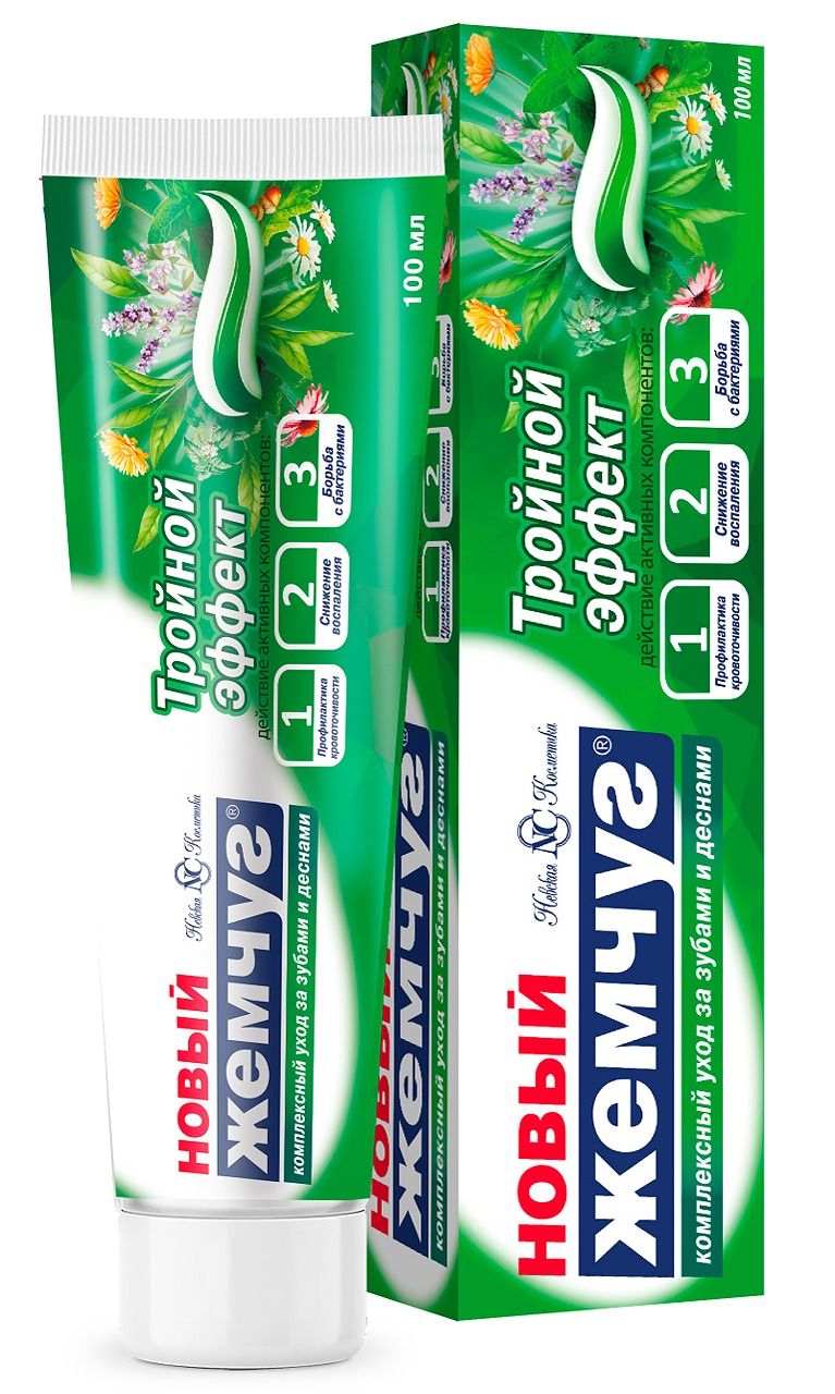 Новый Жемчуг зубная паста тройной эффект 100 млЗубная паста комплексного действия. Подходит для использования вcей семьей, включая детей от 14 лет. Комплексный уход за зубами и деснами, защищает от кариеса, реминерализует, сохраняет естественную белизну зубов, предотвращает ее пожелтение, препятствует образованию налета, содержит активный комплекс «кальций +фтор», активные компоненты подавляют рост зубного камня, освежает дыхание.