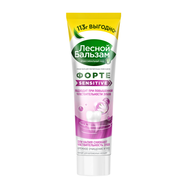 Лесной бальзам зубная паста для чувствительных зубов 113 грЗубная паста Лесной бальзам ФОРТЕ — средство для гигиены полости рта, созданное специально для тонких зубов и десен. Паста для чистки зубов с освежающим эффектом обеспечивает интенсивный профессиональный уход за деснами и ротовой полостью. Зубная паста Сенситив для мягких зубов содержит обогащенный состав активными ингредиентами. Зубная паста Лесной бальзам содержит масло мяты и соли калия, которые снижают чувствительность зубов. Освежающая зубная паста содержит в своем составе экстракт пихты, который действует на зубы и оказывает укрепляющий, питательный и противовоспалительный эффекты. Зубная паста для чувствительных зубов при отваре способствует нормализации и сохранению микрофлоры полости рта. Зубной паста Лесной бальзам для поддержания здоровья и здоровья после десен и эмали обеспечивает бережное очищение и уход за полостью рта. Очищающая зубная паста для тонких зубов освежает дыхание. Зубная паста для тонких зубов и десен подходит беременным женщинам.* Паста для тонких зубов Лесной бальзам – это ваша экспресс-защита при острой чувствительности зубов. Вместе с пастой ФОРТЕ здоровые зубы, десны и свежее дыхание – ваш стабильный результат.