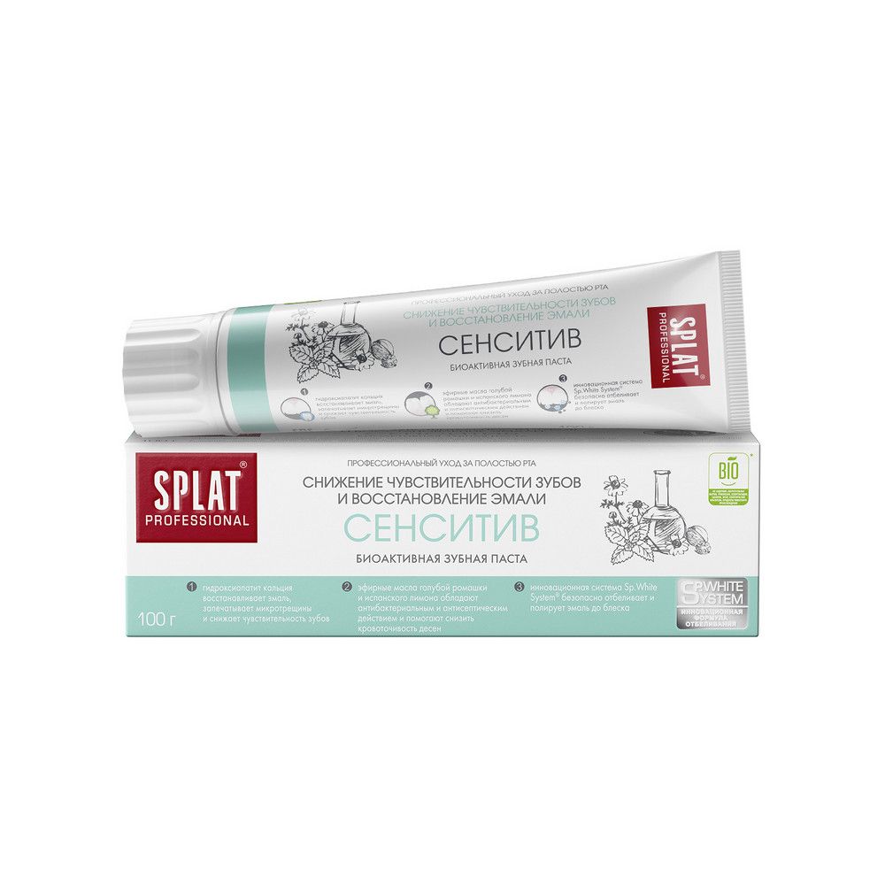 Splat professional зубная паста сенситив для чувствительных зубов 100 гЗубная паста SPLAT Professional «Сенситив» () укрепляет эмаль, снижает чувствительность и кровоточивость десен. Натуральный фермент папаин в сочетании с компонентом полидон расщепляют налет. Комплекс.White безопасно отбеливает зубы. Гидроксиапатит восстанавливает эмаль, восполняет потерю минералов и уменьшает чувствительность зубов. Эфирные масла ромашки и испанского лимона снижают кровоточивость десен. Растительный антисептик ® защищает от кариесогенных бактерий.